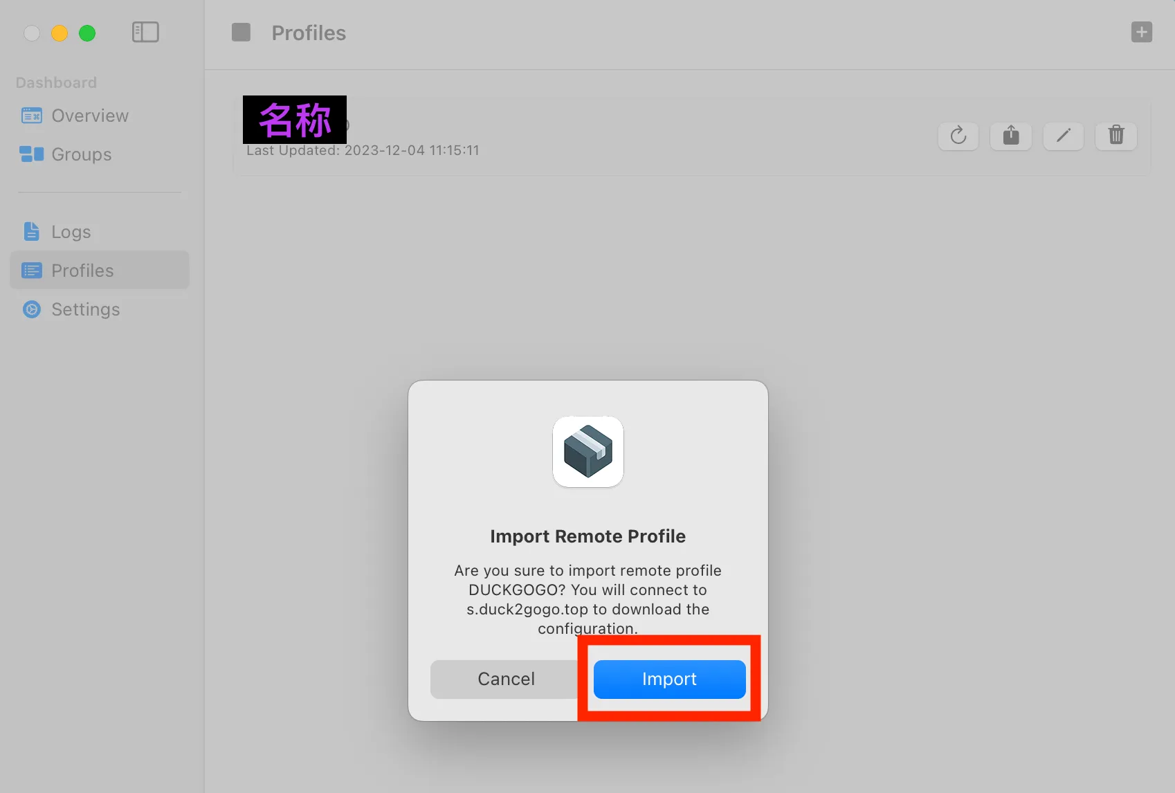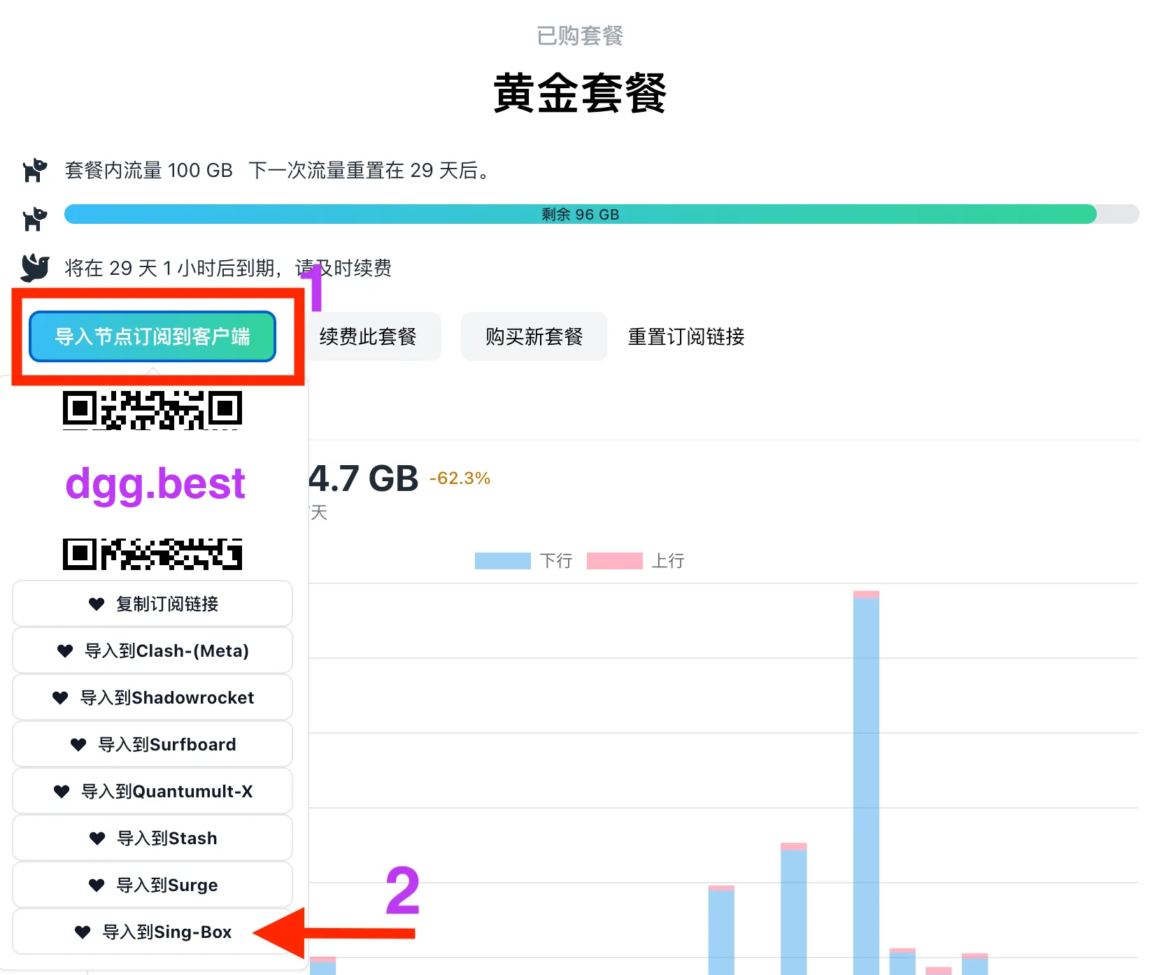 进入相见欢首页,点击按钮导入节点订阅到客户端,然后点击导入到Sing-Box