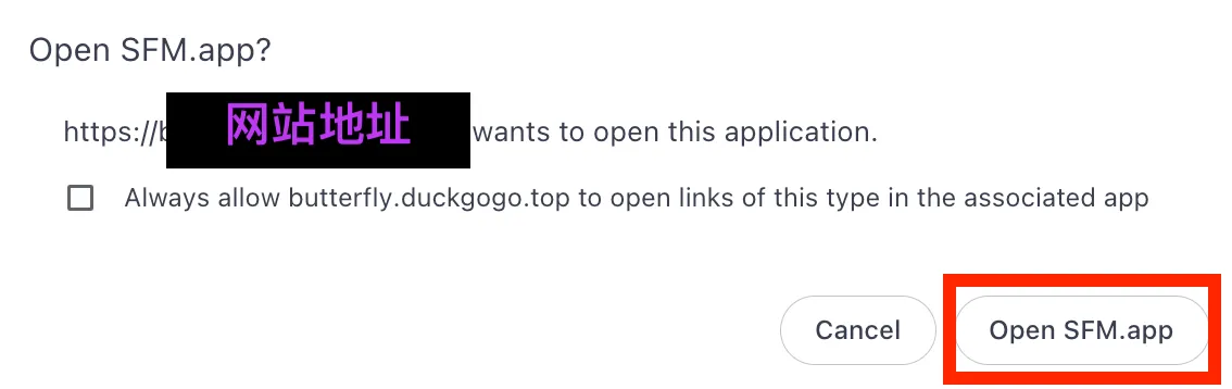 查看浏览器上方的弹窗, 点击Open SFM.app
